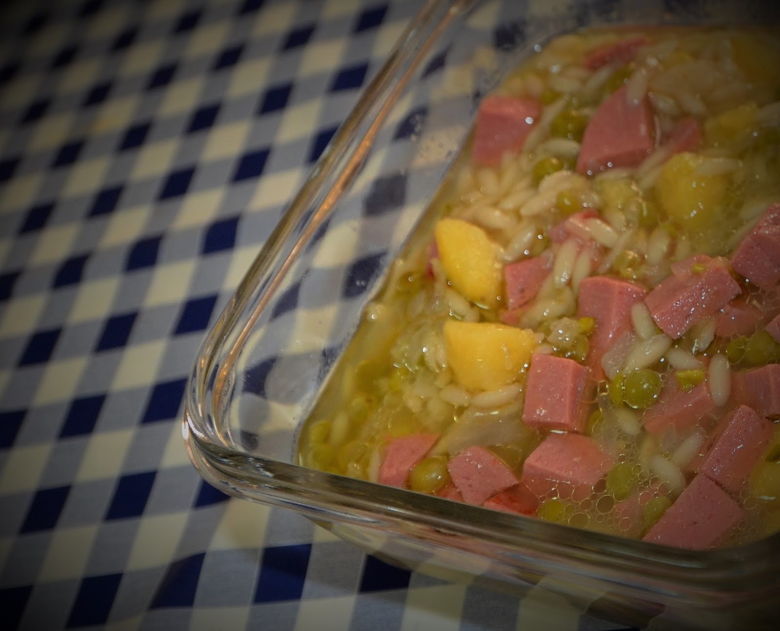 Heat oil in a small pressure cooker. Add in the onions and fry till translucent. Add in the potato, peas (except the ham) and about 1/2 tsp of salt. I haven't used a stock cube here, as I tend to avoid using them if I am cooking specially for my little one.